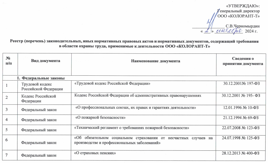 Реестр законодательных, иных нормативных правовых актов и нормативных документов, содержащий требования в области охраны труда, применимые к деятельности ООО «КОЛОРАНТ-Т»