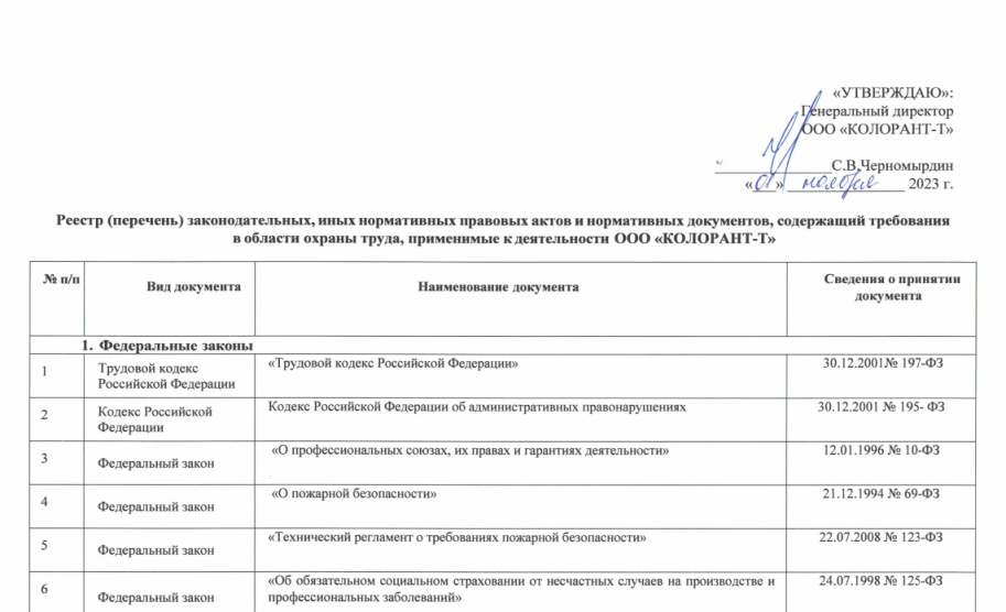 Реестр законодательных, иных нормативных правовых актов и нормативных документов, содержащий требования в области охраны труда, применимые к деятельности ООО «КОЛОРАНТ-Т»
